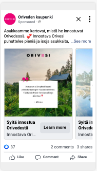 GOsome on toteuttanut Oriveden kaupungin somemainontaa asiakkaan strategian ja tarpeiden mukaan. Facebookissa ja Instagramissa on mainostettu muun muassa kaupungin ajankohtaisia asioita ja tapahtumia, tuotu esiin asukkaiden tarinoita, tehty tonttimainontaa ja kerrottu Oriveden ainutlaatuisista mahdollisuuksista.